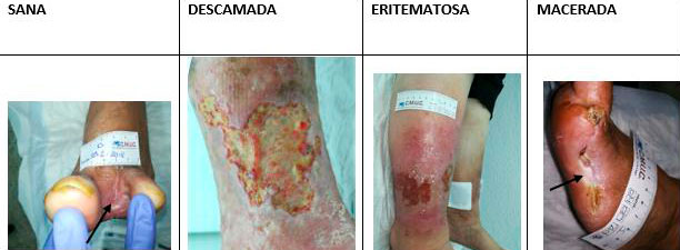 - Piel eritematosa: epidermis enrojecida por acción mecánica, presión, fricción o dermatitis irritativa. Si se acompaña de calor local puede ser signo de infección.